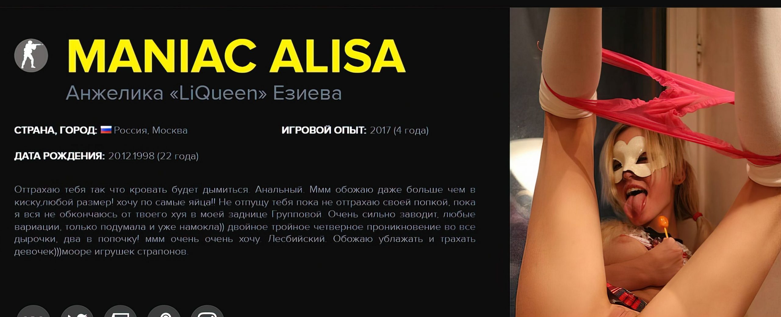 Анжелика Езиева, известная под псевдонимами LiQueen, Maniac Alisa и Анжелика Смит, является российской блогершей и бывшей актрисой в жанре 18+. Восхождение ее популярности произошло осенью 2020 года после предложения руки и сердца от Кирила Михайлова (Бумчик) на PGL Major Stockholm. Однако радость Езиевой была недолгой — вскоре в интернет утекли компрометирующие материалы о ней, раскрывающие прошлое работы в эскорте и участие в эротических видеороликах.